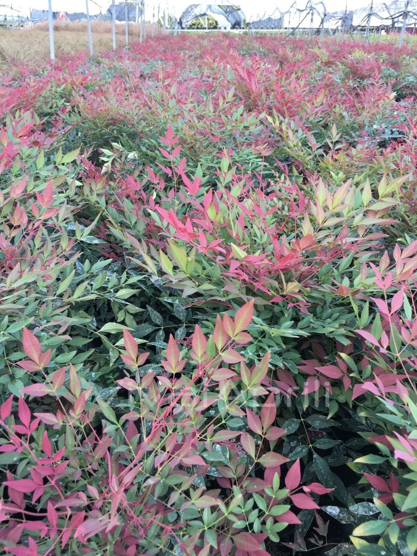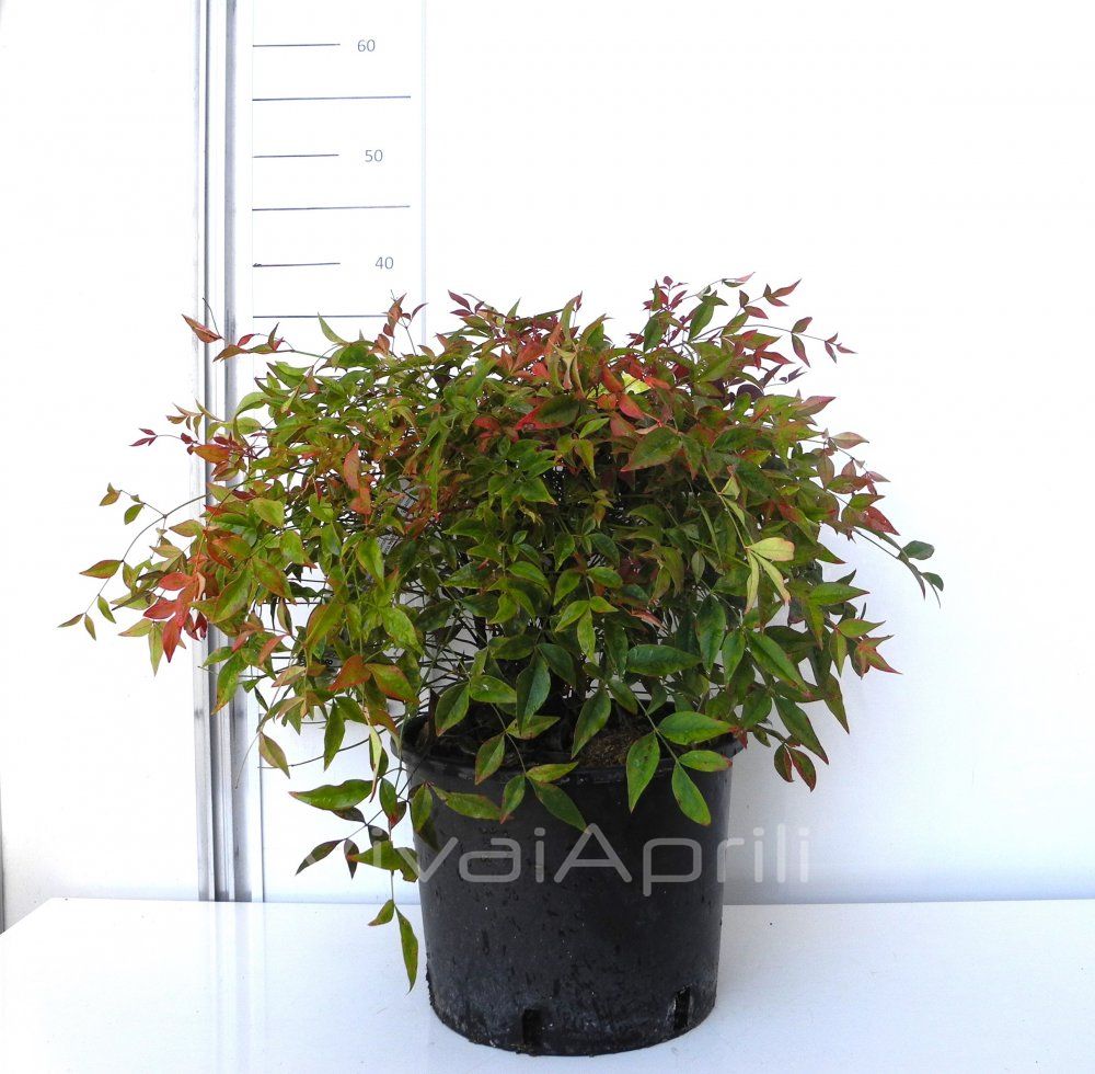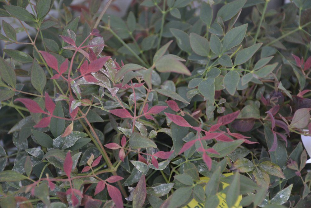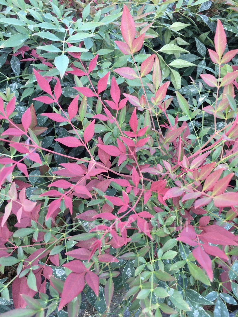 Le foglie sono di piccola dimensione e crescono su fitti e sottili fusti, le più vecchie sono verde scuro, mentre i nuovi germogli si colorano di rosa e poi di rosso soprattutto durante la stagione invernale. Hanno una forma ellittica molto similiare alla Nandina 'Gulf Stream'. Il suo portamento è compatto e in genere non supera i 60/80 cm, questo la rende ottima per vasi, fioriere, e bordure. Ma risalta molto bene anche in un’aiuola mista ad altri arbusti.